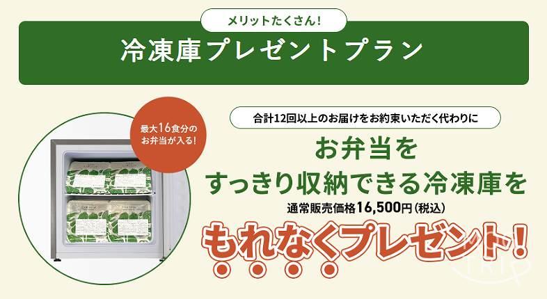 「冷凍庫プレゼントプラン」は〝月に1回以上・合計12回以上〟注文することを確約することで、最大16食分のお弁当が入る冷凍庫がもらえ、さらに割引が受けられるプランです。